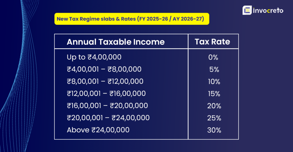Under new tax regime, following slabs apply for FY 2026-27. This slab structure is same across all individuals, no different age-based like earlier.